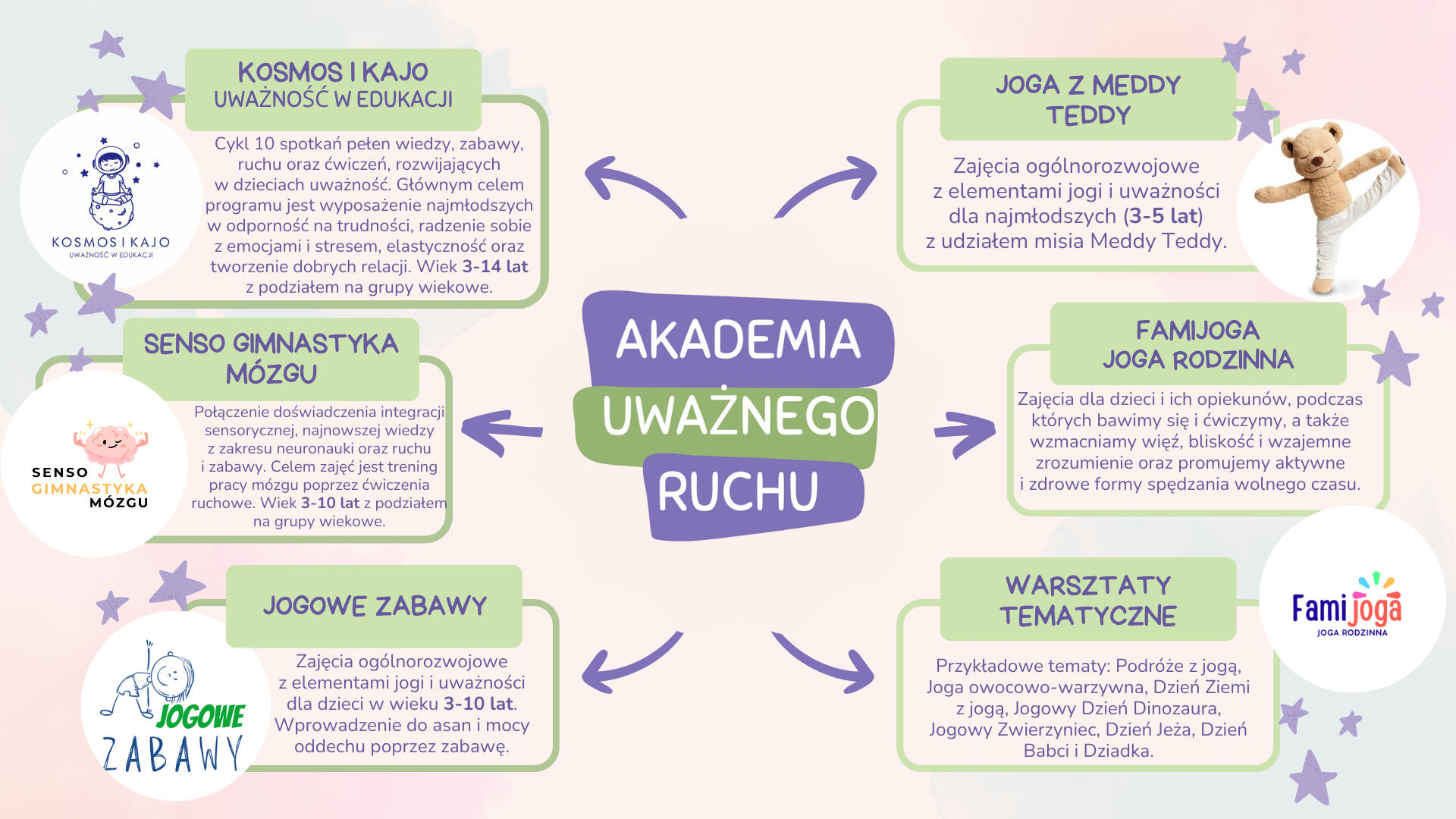 Akademia Uważnego Ruchu to przestrzeń, w której dzieci i ich opiekunowie mogą wspólnie odkrywać radość z ruchu, rozwijać swoje umiejętności oraz budować silne i zdrowe relacje.